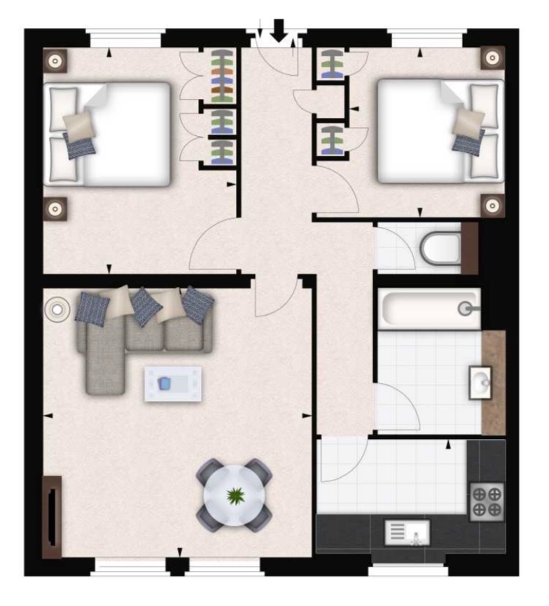 The apartment consists of large reception room and bright modern kitchen with fully integrated appliances. Large windows running along one side of the reception room give the room a fantastic sense of openness and space.