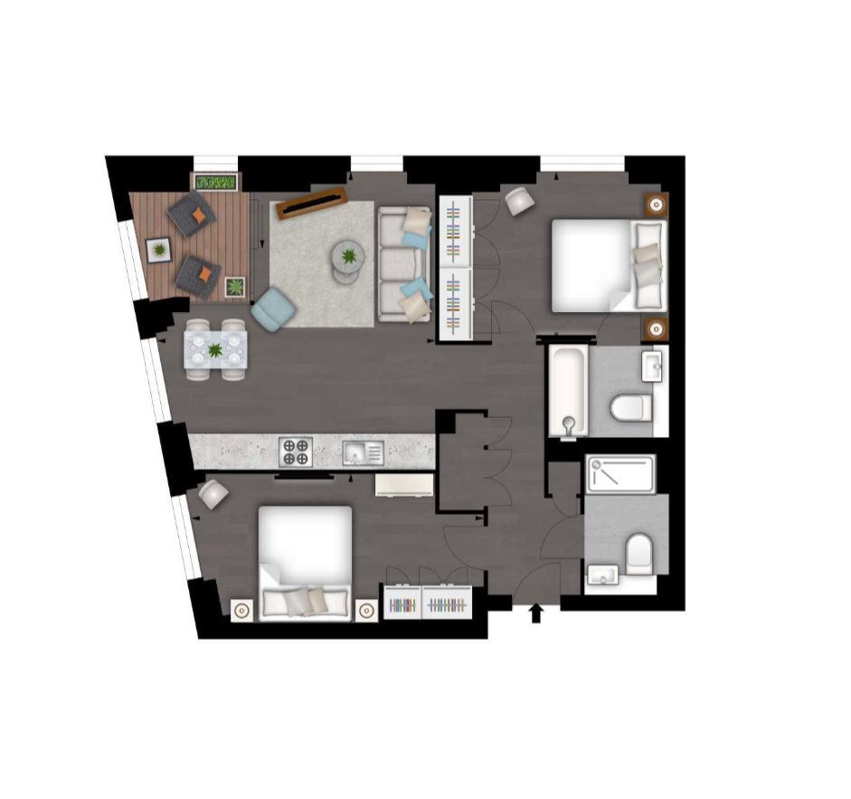 The apartment comprises a spacious reception room complete with Samsung Smart TVs with Bose sound bars alongside a private winter garden creating a further living area. The reception room is open plan with a fully fitted kitchen featuring integrated AEG appliances with floor to ceiling windows providing far reaching views across London. The apartment offers two double-bedrooms, two-bathrooms, one of which is an en-suite bathroom from the master bedroom. The apartment also benefits from ample storage space.