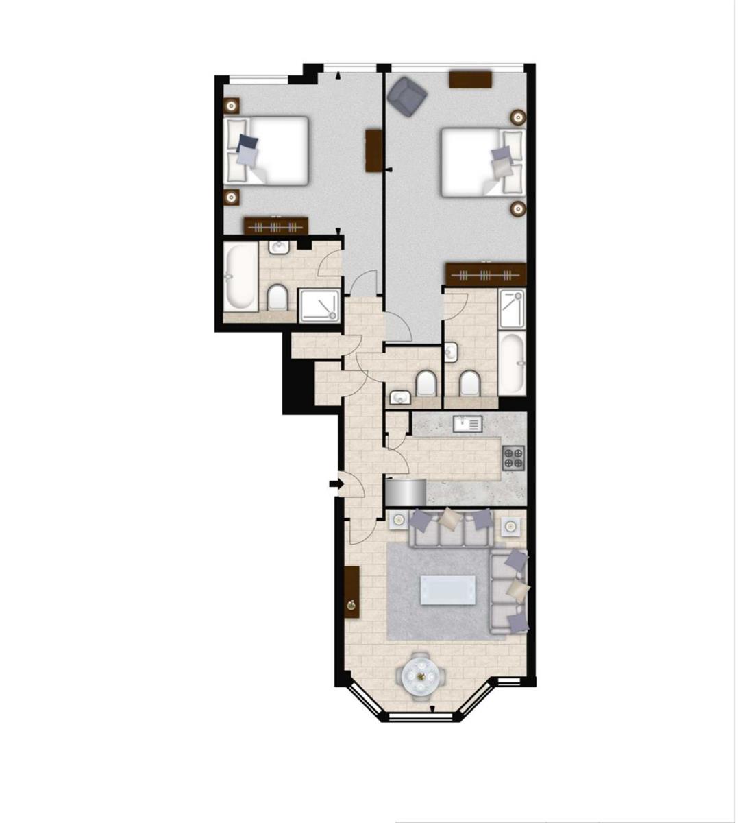 Newly refurbished apartment set over 1,334sq ft comprising two bedrooms, both with en-suite bathrooms and the master bedroom also features a fantastic walk in wardrobe. The apartment has a very large reception /dining area leading into spacious kitchen with fully integrated appliances.